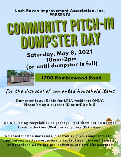 Take the opportunity to dispose of any unwanted household items during LRIA's 2021 Community Pitch-In Dumpster Day. The roll-off dumpster will arrive Saturday morning, and retrieved Saturday afternoon. This event is made available for LRIA residents ONLY... ID will be required!