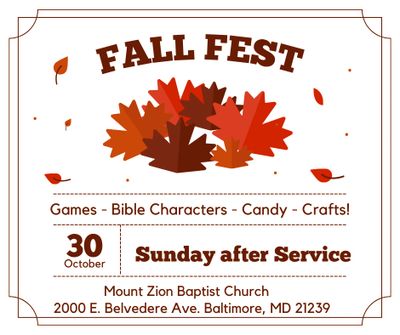 Mount Zion Baptist Church announces its annual Fall Festival on Sunday, October 30th, 2022, with a celebration of fun, food, crafts, and pre- Halloween theme of biblical characters.