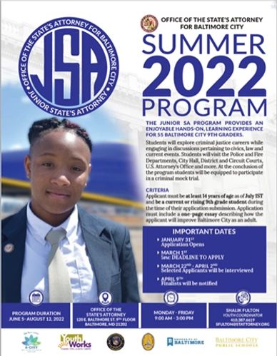 The Junior State’s Attorney (JSA) program is a six-week summer intensive for current and rising ninth-grade Baltimore City students. The JSA program aims to build trust and faith in the criminal justice profession by exposing students to careers in the fields of criminal justice and government. Students are selected based on a written essay, application and interview.